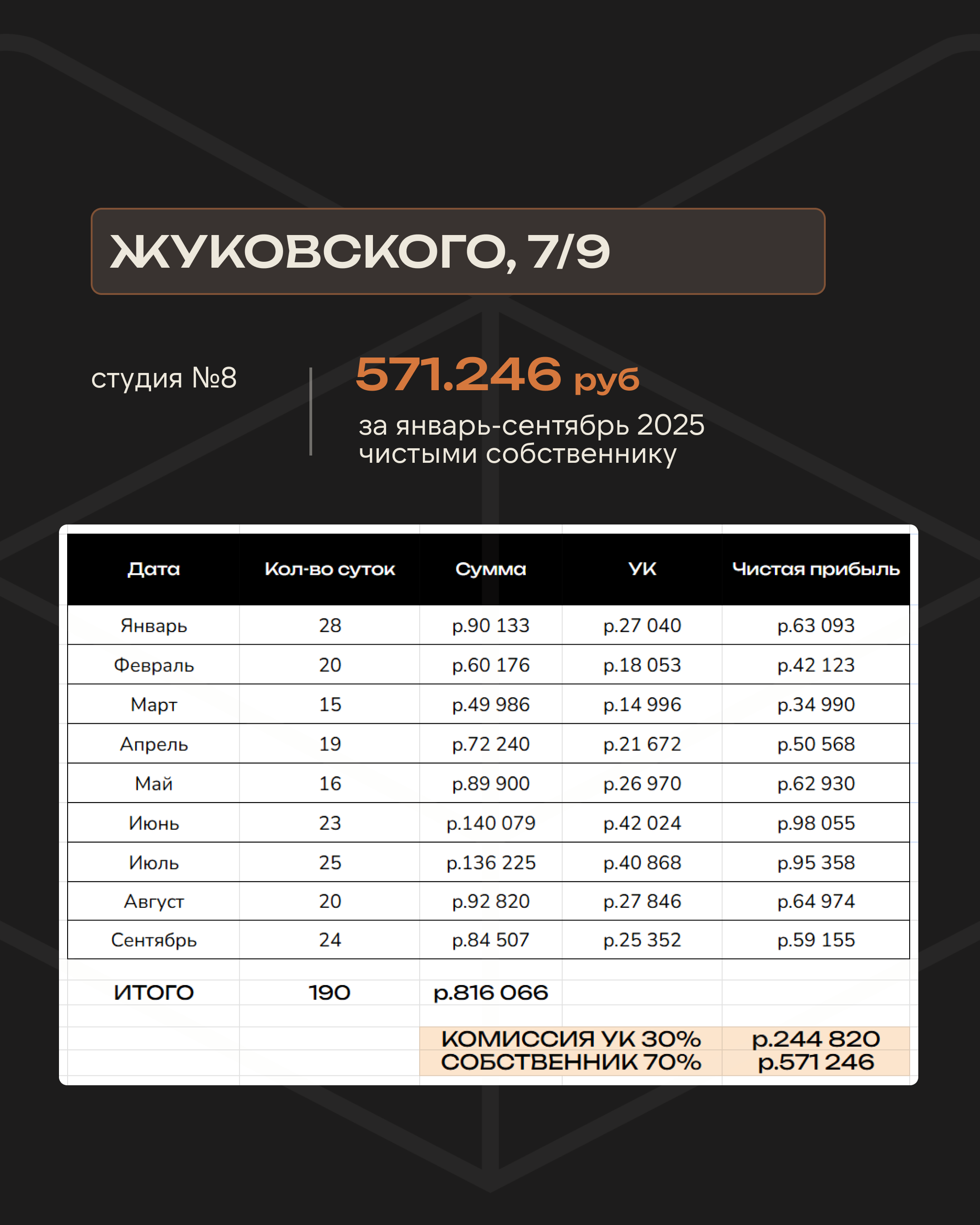 рекламу объекта, заселение гостей, клининг и предоставляем подробный отчет каждый месяц