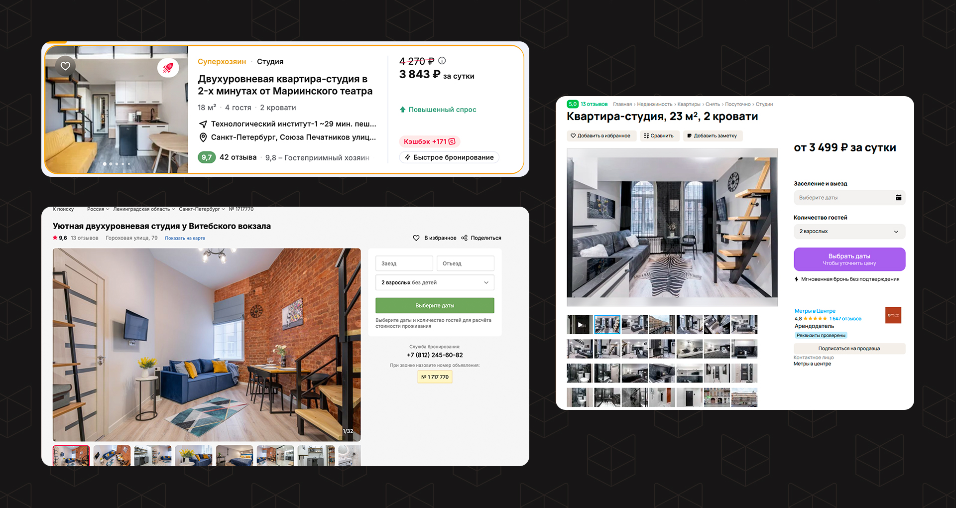 Вот как выглядят стандартные объявления наших квартир: мы оформляем их таким образом, чтобы они были привлекательны для гостей, используя возможности платформ.