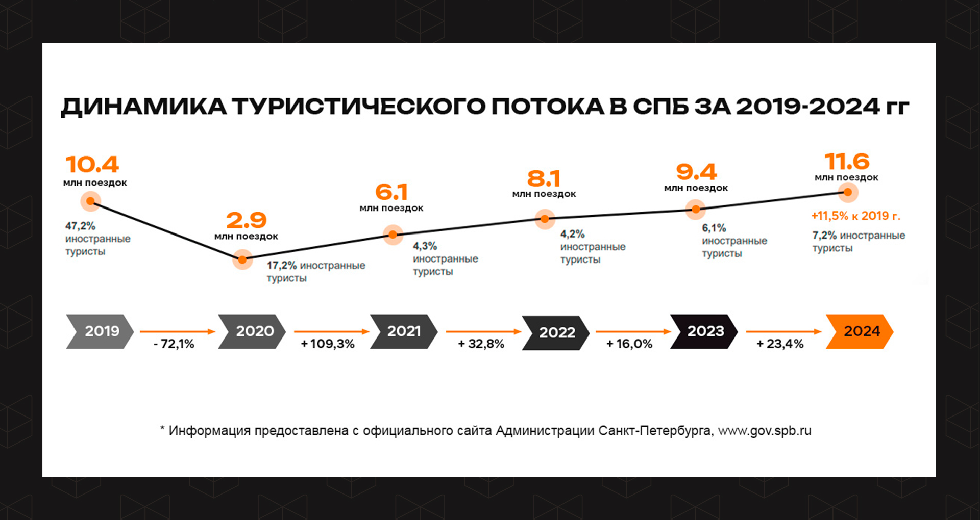 ● Санкт-Петербург ежегодно принимает более 11 млн туристов;